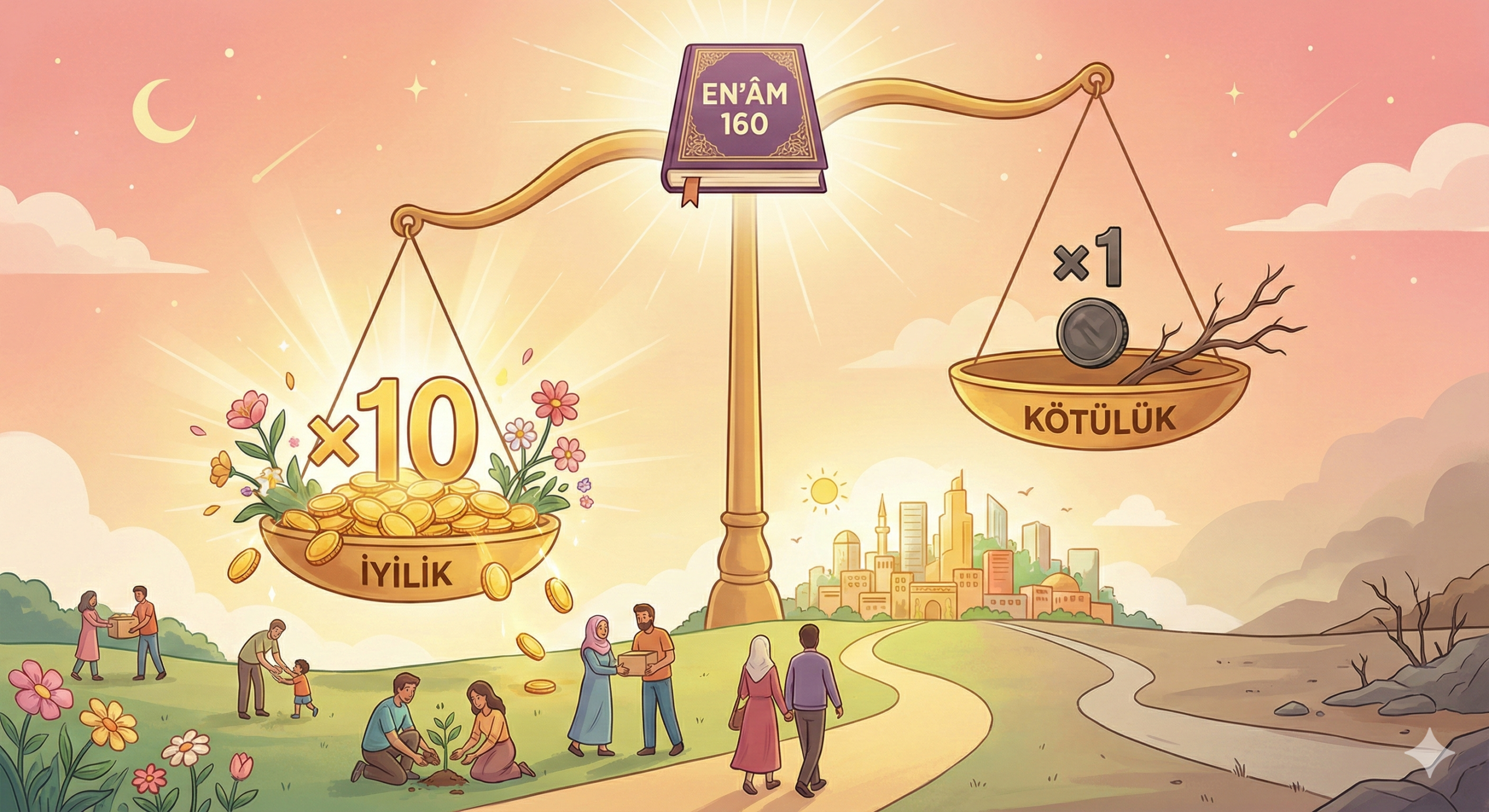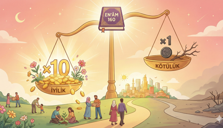 En‘âm 160. ayet, Kur’an’daki ilahi adalet – ödül-ceza dengesinin en berrak formüllerinden biridir. Ayeti cümle cümle, hem psikososyal (insan davranışı–toplum etkisi) hem de ilahi sistem (Allah’ın koyduğu evrensel yasa) açısından, diğer ayetlerle birlikte ele alalım.